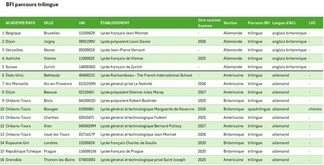 Der parcours trilingue kann von sections internationales und von classes de cycle terminal, die zum Baccalauréat français international führen, in Frankreich und in französischen Auslandsschulen angeboten werden. Für alle Parcours-Trilingue-Schulen mit einem deutschen Prüfungsteil gilt die deutsch-französische Verwaltungsvereinbarung zum BFI!